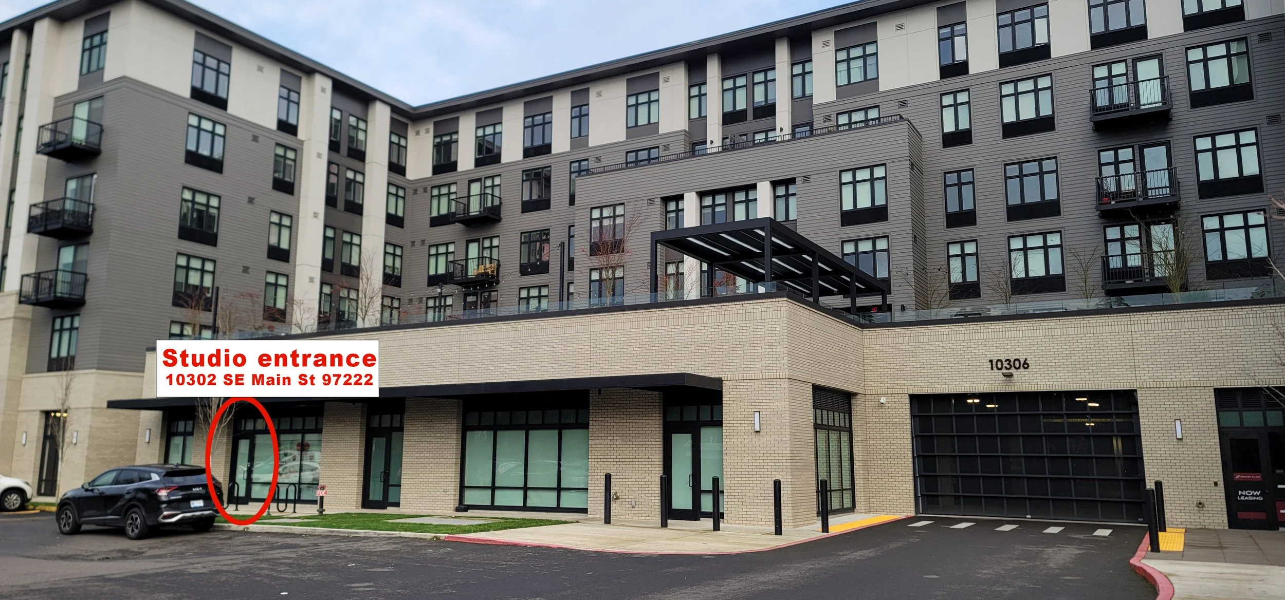 When facing the Henley Place apartment building, the studio is the third door to the left of the large garage door.